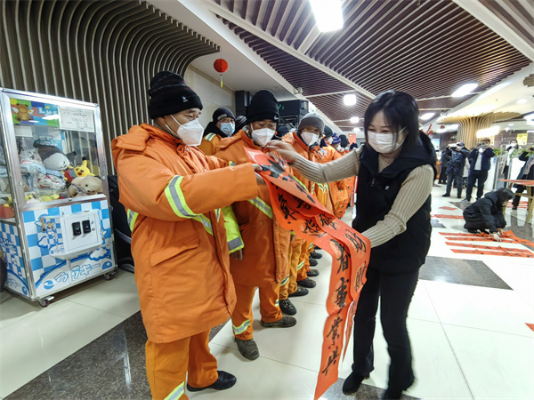 現(xiàn)場,參加活動的群眾開心地挑選著自己心儀的春聯(lián)、“福”字,大家相互分享,喜笑顏開。同時,市圖書館還將手寫春聯(lián)和臺歷送到環(huán)衛(wèi)工人手中,衷心感謝他們一年來的辛勤工作。今年60歲的環(huán)衛(wèi)工人齊德玉拿到春聯(lián)后笑著說:“小時候,家家戶戶都貼手寫春聯(lián),后來就是買現(xiàn)成的,雖然好看,但總感覺少了點兒啥,還是手寫春聯(lián)更有年味。”