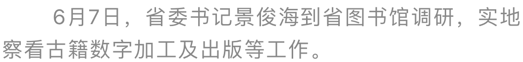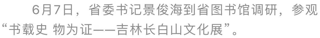 會前,景俊海來到省圖書館古籍書庫,實地察看古籍保護修復(fù)、數(shù)字加工、研究整理等工作,要求進一步加強歷史典籍版本收集,抓好分級分類管理保護,利用豐富資源推出更多古籍研究成果。要深入推進古籍?dāng)?shù)字加工,建好線上發(fā)布平臺,更好滿足讀者需求。“書載史 物為證—吉林長白山文化展”采用文獻與文物對照方式,生動展現(xiàn)了吉林長白山文化發(fā)展歷程。參觀中,景俊海感慨地說,吉林長白山文化源遠流長,是中華優(yōu)秀傳統(tǒng)文化的重要組成部分。要善于活化利用文獻文物,創(chuàng)新講好背后蘊含的歷史故事,更好地宣傳普及吉林歷史文化知識,切實把吉林長白山文化傳承下去、發(fā)揚光大。