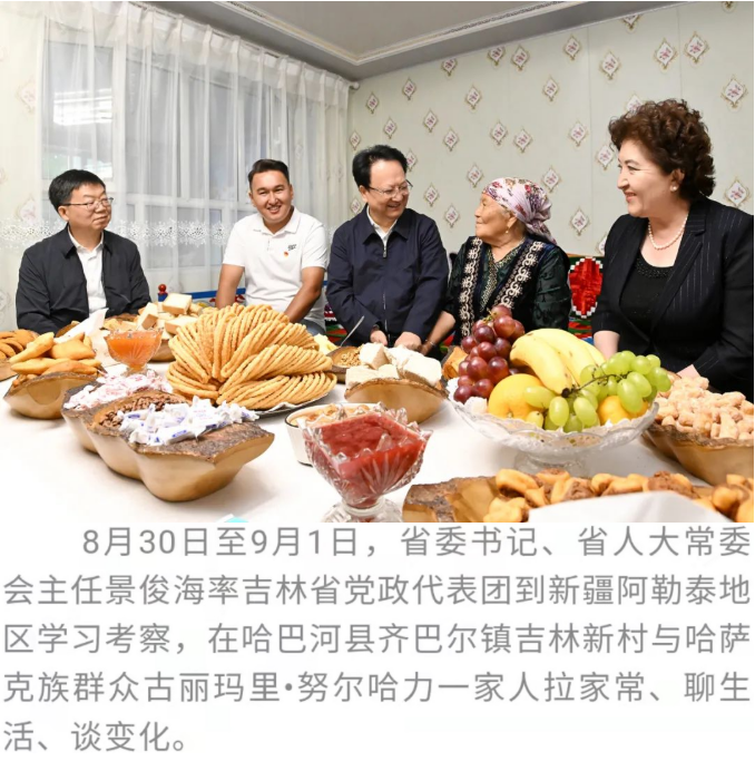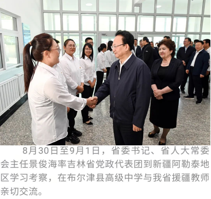 8月30日至9月1日,省委書記、省人大常委會主任景俊海率吉林省黨政代表團到新疆阿勒泰地區,就認真貫徹習近平總書記關于新疆工作和對口支援工作的重要論述、推動吉林對口援疆工作高質量發展進行學習考察,深入我省對口支援的阿勒泰市、吉木乃縣、布爾津縣、哈巴河縣,實地了解對口支援各項工作開展情況。新疆維吾爾自治區人大常委會黨組書記、主任祖木熱提·吾布力參加活動。