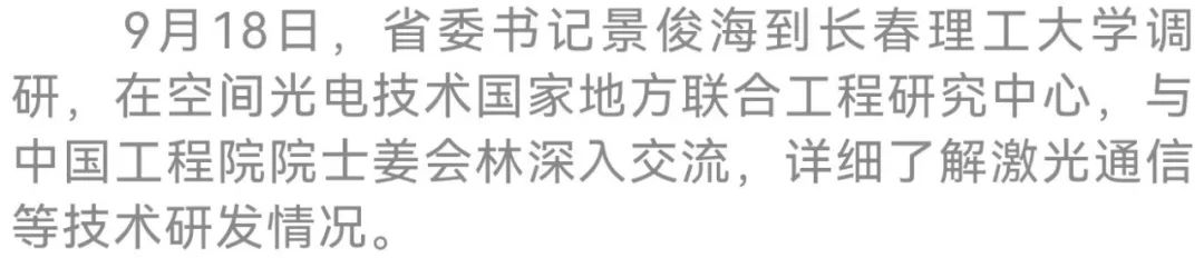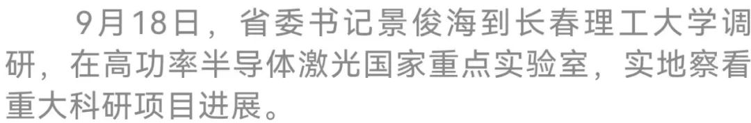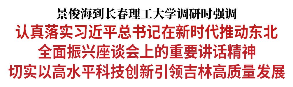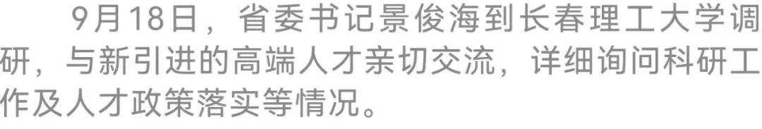 今天(9月18日),省委書記景俊海到長春理工大學調研。他強調,要認真落實習近平總書記在新時代推動東北全面振興座談會上的重要講話精神,深入實施創新驅動發展、科教興省、人才強省戰略,努力建成全國重要人才中心和創新高地,切實以高水平科技創新引領吉林高質量發展。