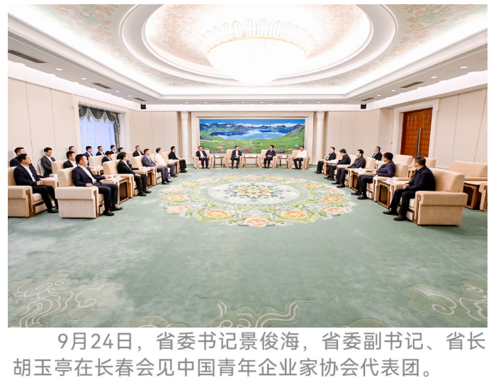 9月24日,省委書記景俊海,省委副書記、省長胡玉亭在長春會(huì)見中國青年企業(yè)家協(xié)會(huì)會(huì)長,伊利實(shí)業(yè)集團(tuán)股份有限公司黨委書記、董事長、總裁潘剛率領(lǐng)的中國青年企業(yè)家協(xié)會(huì)代表團(tuán)一行。