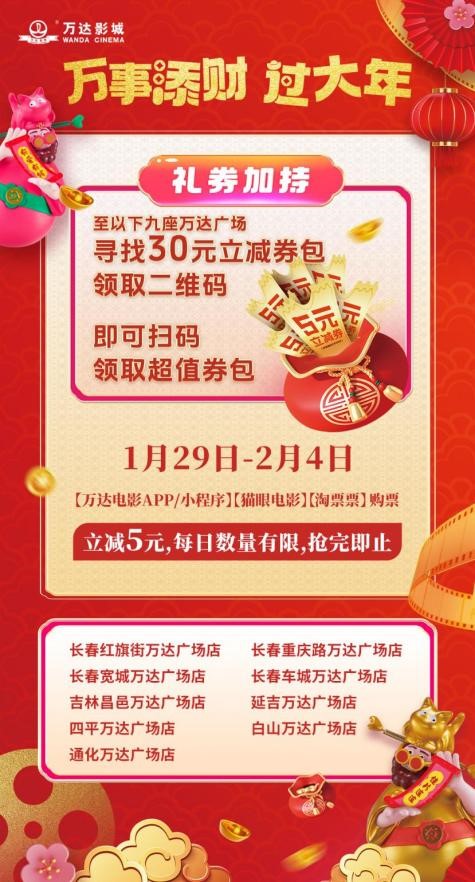 萬(wàn)粉迎福運(yùn),在春節(jié)期間加入萬(wàn)達(dá)影迷團(tuán),還可瓜分千萬(wàn)新春補(bǔ)貼!超值觀影優(yōu)惠券、新春寶箱、紅包雨等豐富多彩的優(yōu)惠活動(dòng)等你參加。同時(shí),省內(nèi)九座萬(wàn)達(dá)廣場(chǎng),開(kāi)啟新春享新禮活動(dòng)!至省內(nèi)萬(wàn)達(dá)影城直營(yíng)店所在廣場(chǎng),尋找活動(dòng)二維碼,即可掃碼領(lǐng)取30元立減券包!同時(shí),1月29日至2月4日,萬(wàn)達(dá)電影APP/小程序、貓眼電影、淘票票購(gòu)票立減5元,每日數(shù)量有限,搶完即止。