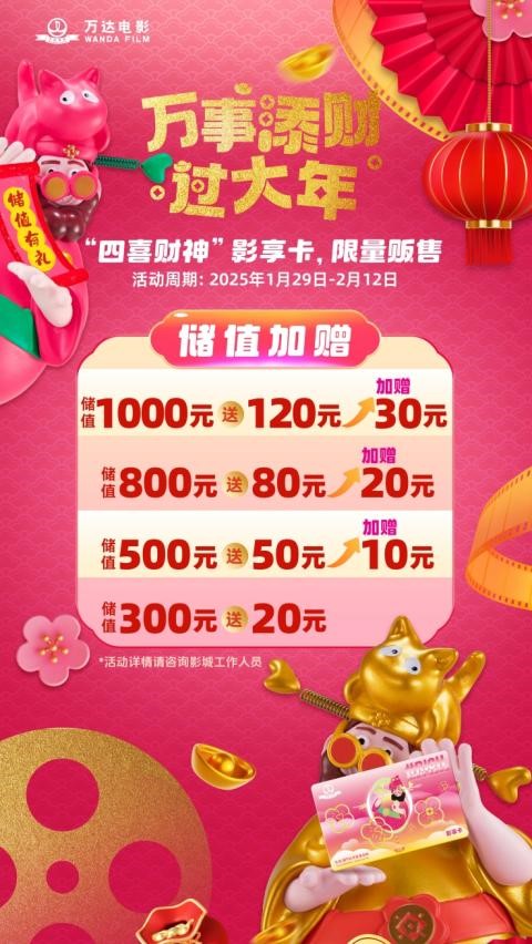 自春節(jié)檔影片預(yù)售開(kāi)啟,登陸萬(wàn)達(dá)電影APP/小程序購(gòu)票,尊享不定時(shí)立減活動(dòng),更有新年紅包限時(shí)派發(fā)。同時(shí)推出119.9元限時(shí)雙人超值禮包。六張優(yōu)惠券,暢享春節(jié)精彩大片!大年初一至正月十五,到吉林省內(nèi)萬(wàn)達(dá)影城辦理影享卡,尊享儲(chǔ)值加贈(zèng),最高儲(chǔ)值1000元贈(zèng)送150元。更有四喜財(cái)神卡面限量販?zhǔn)邸Hf(wàn)事添財(cái),歡歡喜喜過(guò)大年!